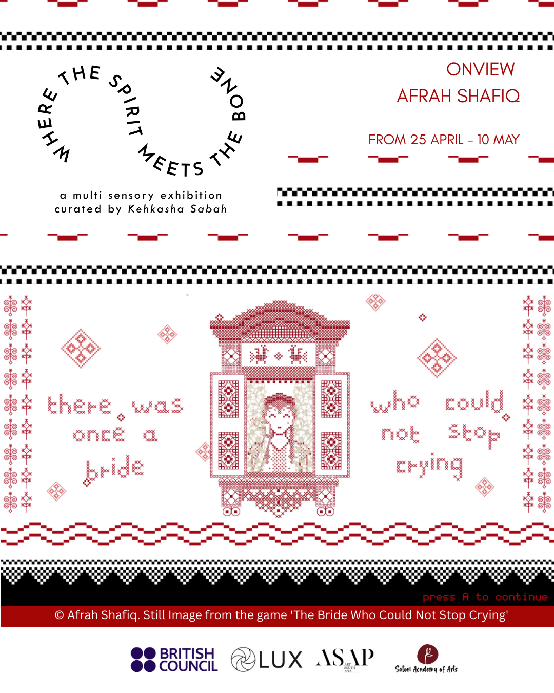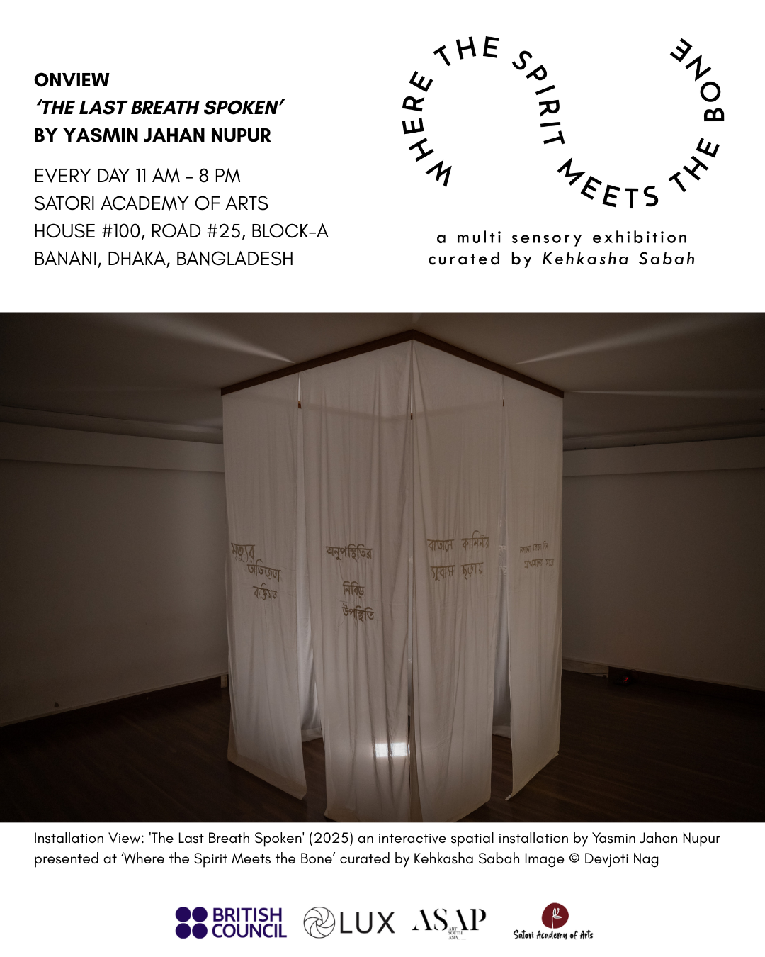 “Taking its title from the poem ‘Compassion’ by American poet Miller Williams, Where The Spirit Meets the Bone is a speculative project evoking profound internal space for reflection and care, necessary in the often indescribable human terrain where vulnerability converges. The project is a curatorial experiment – staging a two-fold exhibition and letting them move and morph inside one venue. Hosted at Satori Academy of Arts in Banani, Dhaka, in a serene urban space dedicated to meditation and individual consciousness, helps to amplify the exhibition’s curatorial vision.”