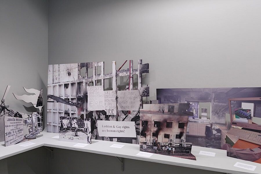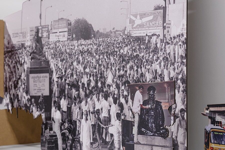 The installed images start with – Khan Abdul Gaffar Khan aka Frontier Gandhi, who was a political and spiritual leader known for his nonviolent movement and opposed the partition of India. The images chosen here, are from his 1937’s active movements, where we see his meetings with a group of full-turbaned Sikhs or the army of Khudai Khidmatgars, and sequentially his images end with his elderly wheel chaired version with a delegation including Rajiv Gandhi[3]. Between this line of narration, in some images, you can identify the important presence of the minority leaders as well. Especially, Mehbooba Mufti, an Indian politician of the Jammu and Kashmir (Peoples Democratic Party) and Dalit Panthers of India, Periyar E. V. Ramasamy - a Father of Dravidian Movement, who was critical of any form of nationalism and promoted the principles of rationalism, self-respect, women’s rights, and eradication of caste. This sequel of a political narrative, from nationalism to critique of nationalism, intervenes with the symbolic interpretation of Things, Events, and Persons in many more layers, far-reaching and impossible to conclude in any finite line. Also, in putting together cutouts of major mass protests or gatherings, such as the protests in favor of the film ‘Fire’ or the investigation into Rajiv Gandhi’s killing, it might be noticed a clear trajectory of history being established. And this is where the title of the show comes in – ‘A Photogenetic Line’. The line could be anything, from representing a forward movement to some borders or barriers. The line is also a flexible tool to mold a form voluntarily—which is what the exhibition attempts to do as it allows one exhibit to speak to its neighbor and leaving the audience for a wide guessing.