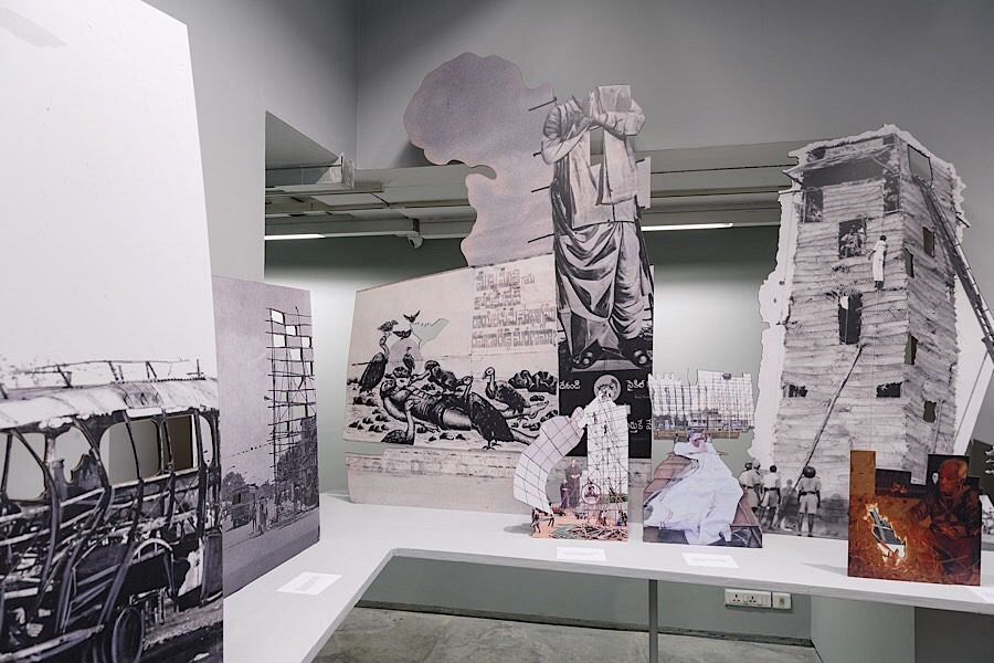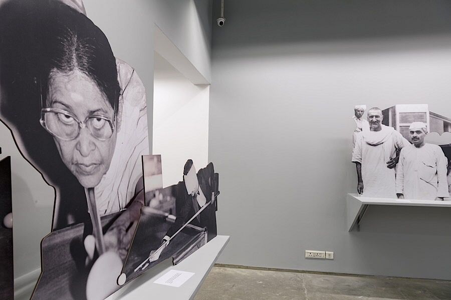 After entering the exhibition, a 100-foot long branching sequence of cardboard cutouts with photos (blown-up images from actual size), staged on a contentious wooden plinth holding on the irregular wall across the full venue will amaze anyone. The photographs, in both color and monochrome, have been reproduced for the exhibition. They were collected from the photojournalist archive of the Hindu, a leading national newspaper, by the film and media collective - CAMP. To a close inspection, the images installed here dated from 1937 to 2018. And stepping far back from the installation the whole art piece stand together in layers like a 3D montage - dashing front and back, cuts in the edge or punched in inside, juxtaposed in content or referral side by side with figures, peoples, places, objects, landscapes, and architecture colliding verses of multiple (political/apolitical) histories of India. This tableau-like setting is anything but the outcome of an archive simply revisited.