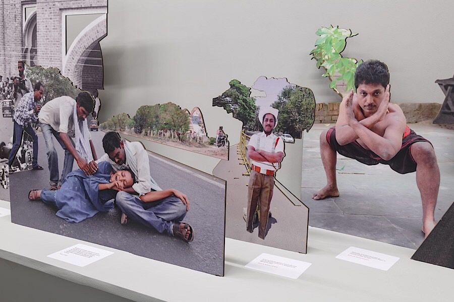 First, through this work Camp questioned an old archive with its stagnant quality which got altered in total newness, became interactive and more contextual to the contemporary time. Second, the whole process of the work, plywood cutouts of people/public figures as propaganda materials, is very referential to the people of India from their everyday visual culture. Because political leaders from India using similar forms during elections or events for more than eighty years. Sometimes these cutouts’ enormous sizes presented as a modern myth of demi-gods and the quantities inside a city, do block the horizon. Signifying to this - horizon blocking, Camp preferred to pick both political and apolitical images, and layered them in three special ways considering a sequence of peoples (in the photos) growing in age/reverting, things in the background come to the foreground and two Captions (of photos) refer to each other. These instructions on the exhibition handout, create several narratives of the photos- by dismantling every people, things, and places equally important and force them to appear as a de-constructed political horizon line to its viewers.